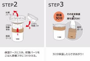 ランチタイムにも炊き立てのごはんが楽しめる商品。容器に米と水を入れ、炊飯パーツを取り付けて電子レンジで8分加熱。その後、30分ステンレス製魔法瓶で保温し蒸らすことで、浸水なしでごはんが炊きあがる。「自宅で炊飯器代わりとしても使える」という。