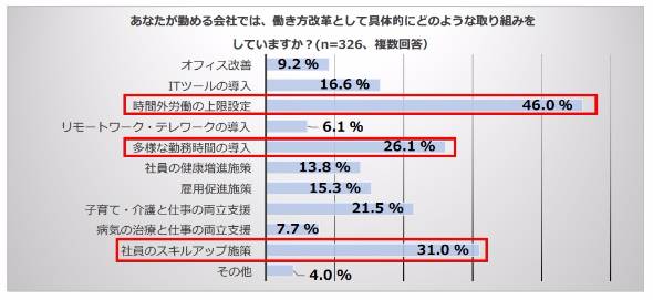 具体的に取り組んでいる内容は、「時間外労働の上限設定」(46%)、「社員のスキルアップ施策」(31%)、「(朝方勤務、時短勤務、フレックスタイムなどの)多様な勤務時間の導入」(26.1%)などが挙がった。改革のために導入したITツールは、メールや電話以外のコミュニケーションツール、営業管理・支援ツール、テレビ会議システム――が上位に並ぶ。