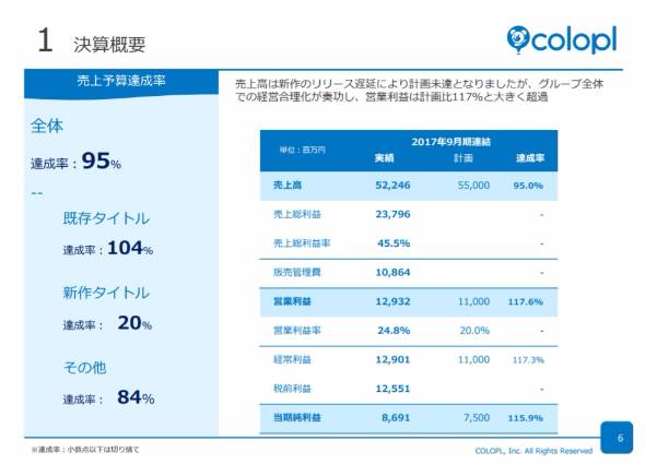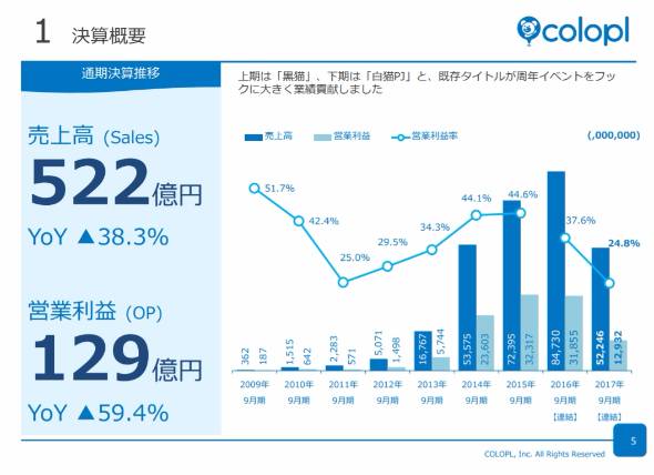コロプラが11月8日に発表した17年9月期(16年10月〜17年9月)の連結業績は、売上高522億円(前期比38.3%減)、営業利益129億円(59.4%減)、純利益は86億円(58.0%減)。もともと大幅な減収減益を見込んではいたが、売上高は予想から5%下回って着地した。