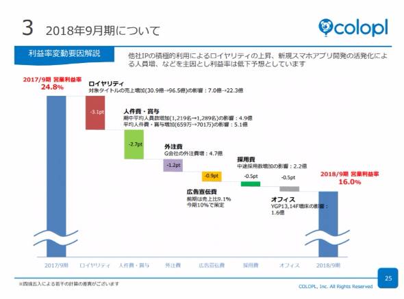 響いたのは新作タイトル開発の遅延だ。「クイズRPG魔法使いと黒猫のウィズ」「白猫プロジェクト」など既存タイトルの周年イベントや、「プロ野球バーサス」「PaniPani」といった新規タイトルが貢献したものの、新作タイトルの達成率が20%と低く、売上高は計画にやや届かなかった。コロプラは連続する新規アプリの投入で既存アプリの落ち込みを補う「積み上げモデル」戦略を取るが、新たな「積み上げ」が足りなかった形だ。