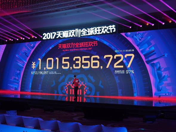 中国のインターネット通販市場において最大の商戦日である11月11日、EC最大手のアリババグループが年次イベント「11.11 GLOBAL SHOPPING FESTIVAL 2017」を上海市内で開催。午前0時のセール開始から過去最速となる3分1秒で流通総額は100億元(約1700億円)を超えた。