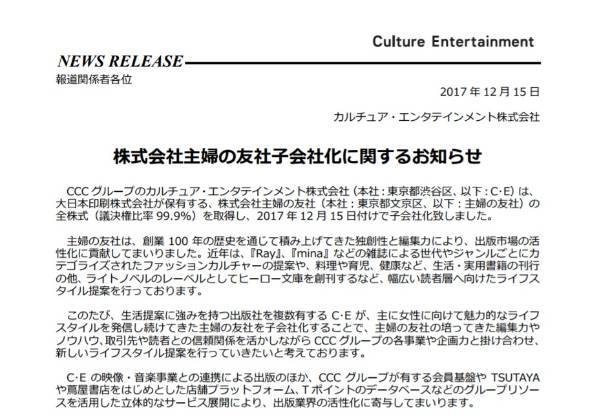 「TSUTAYA」を運営するCCCグループのカルチュア・エンタテインメントは、12月15日付で大日本印刷が保有する主婦の友社の全株式を取得し、子会社化したと発表した。「主婦の友社の培ってきた編集力やノウハウ、取引先や読者との信頼関係を生かしながらCCCグループの各事業や企画力と掛け合わせ、新しいライフスタイル提案を行っていきたい」という。