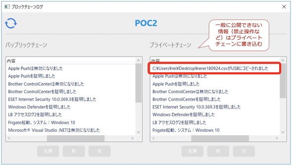 操作ログの記録などは、導入した企業内でのみ閲覧できるプライベートプロックチェーンを使う。一方で、リモートワーカーのアンチウイルス対策状況などの情報は、一般に公開されるパブリックブロックチェーンにも記録することができる。PCの環境などを一般公開することで、質の良いテレワーカーのリストを公開することも可能になる。