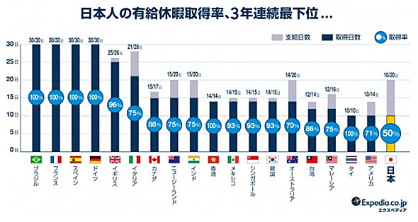 有給休暇国際比較調査を行っているエクスペディアによれば、日本人の有給取得率は50%で3年連続で最下位となっている。