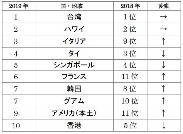 一般社団法人日本旅行業協会が、旅行会社を対象に調査をした「人気旅行先ランキング」では、台湾は年末年始の旅行先で4年連続1位、GWの旅行先では5年連続で1位に輝いている。夏休みの旅行先でも、ハワイとトップを争うのが近年の傾向となっている。