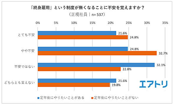 「終身雇用」という制度がなくなることに不安を覚える人は50.6%(とても+やや)。「終身雇用」についてどう思うかを聞いたところ、どの年代でも「賛成」が「反対」を上回った。「賛成」が最も多かったのは50代で44.4%、そこから年齢が下がるにつれ「賛成」の割合は減少。「やはり定年が近づくとともに、終身雇用をしてほしいと願う人が増加しているようだ」(エアトリ)