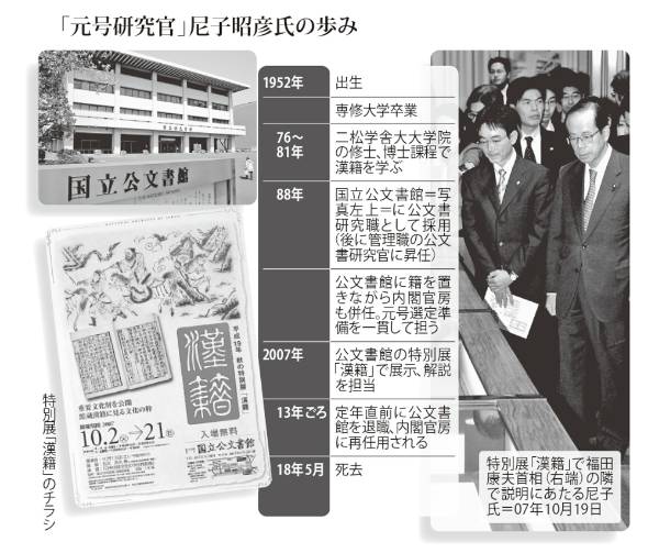 尼子氏の採用時の公文書館長は菅野弘夫氏(2009年に死去)だ。1979年の元号法成立直後に、当時の元号担当だった総務長官を支える事務方トップの総務副長官だった。この時期に政府は、昭和に代わる新元号の考案を学者に依頼している。これに菅野氏が関与した可能性がある。