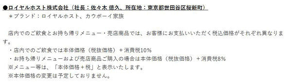 ロイヤルホストは、消費税率引き上げ後も現行の本体価格(税別)を維持し、利用形態に応じて消費税を加算する方針。メニューには「本体価格+税」と記載するという。