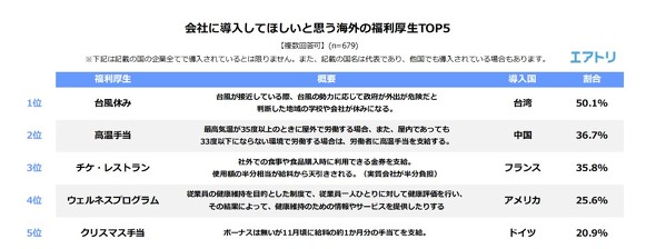 「会社に導入してほしいと思う海外の福利厚生を選んでください」という設問では、台湾の多くの企業で導入されているという「台風休み」が50.1%でトップだった。2019年は日本で大型の台風が相次ぎ、多くの人の関心が集まっていることも理由にはありそうだ。2位は中国で導入されているという「高温手当」で、36.7%。最高気温が35度以上のときに屋外で労働する場合に支給される手当だという。また、屋内でも33度以下にならない環境の場合には支給されるもの。3位は社外で食事したり食料品を購入したりする際に利用できる金券で、使用した額の半額相当分が給料から天引きされるフランスの「チケ・レストラン」がランクインした(35.8%)。