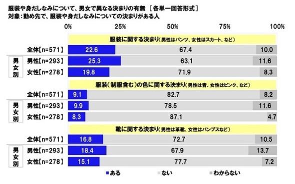 こうしたルールは、男女で差がある企業も多い実態が明らかになった。身だしなみに関するルールがあると回答した人のうち、「男性はスーツを着用しなければならないという決まり」があると回答した人は19.4%、「男性はネクタイをしなければならないという決まり」があると回答した人は19.6%。「女性は化粧をしなければならないという決まり」を課している企業は15.1%も存在した。