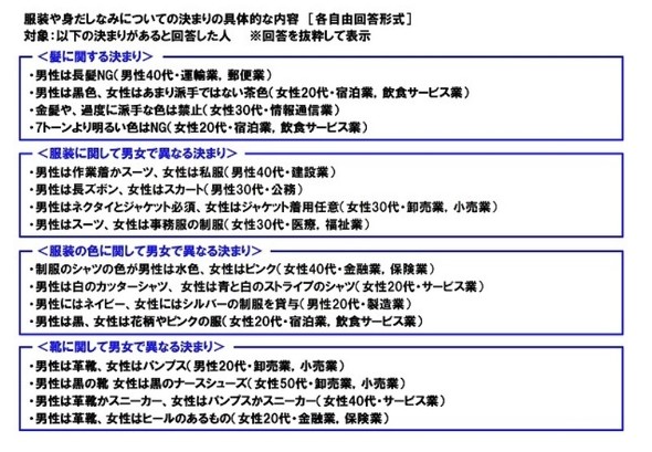 男女で違いがある決まりを自由形式で聞いたところ、「男性は長髪NG」、「男性は黒色、女性はあまり派手ではない茶色」、「男性は革靴、女性はパンプス」などが寄せられた。