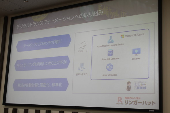 そこで、日本MSのサービスを導入し、効率化を推進している。データベースのクラウド化やマシンラーニングを駆使することで、売り上げや発注予測の自動化を進める。ちゃんぽん店では平日と土日の客層変化が小さく、売り上げ予測や発注予測を立てやすいのだという。一方のとんかつ専門店は平日と土日で客層の違いが大きく、今後は改善を繰り返しながらモデル構築をしていく。「店舗スタッフが事務作業にわずらわされず、お客さまの満足度を高めることに専念できる体制を構築していきたい」と是末氏は話す。