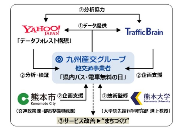 九州産交HD、ヤフー、トラフィックブレイン、熊本市、熊本大学が連携して、公共交通の無料化が社会にどのような影響を与えるのかを実証するというものだ。九州産交のプレスリリースによれば、「同日に収集するデータは、基準日(実施日と同曜日の前後応当日)と比較し、公共交通利用の促進、中心市街地の『賑わい』創出、県内の移動活発化などの視点で、人流・乗換検索・検索ワード(興味関心)などのデータを用いて、産・官・学のさまざまな視点から分析方法を検証していく計画」とされている。