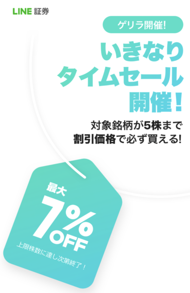 LINE証券は、株式を最大7%オフで買えるタイムセールを2月27日に開催する。タイムセール中、指定された対象銘柄を、1銘柄のみ5株まで購入可能。3%または5%、7%引きで購入できる。またタイムセール中は、取引コストを無料とする。