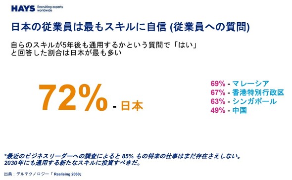 今回行った別の設問では、「自らのスキルが5年後も通用するか」という質問に対し「はい」と答えた割合は日本が最も高く、72%。自信があることは良いことなのかといえば、そうでもないようだ。担当者は「日本は『学ぶ』という意欲を持つ人が少ない。年功序列のレールに乗って昇給することが約束されていることが多いので、学ぶ必要がないともいえる。だから、別に学ぶ必要もない、という意味で自信を持つ人が多いのではないか」と分析する。つまり“井の中の蛙大海を知らず”ということだ。