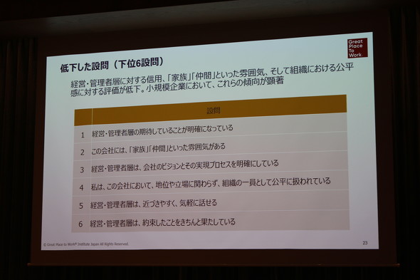 一方、ポイントが低下した項目には「経営・管理者層の期待していることが明確になっている」「この会社には『家族』『仲間』といった雰囲気がある」といった項目が並ぶ。GPTWジャパンの岡元代表は「今回の結果を見ると、働きやすさが向上する一方で、日本企業の働きがい、エンゲージメントが下がってきていることが分かる」と分析する。