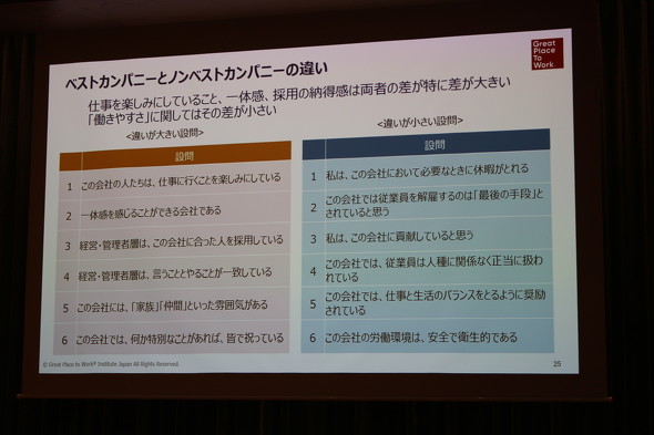 岡元氏は、働きがい向上のキーワードを「信頼感」とした。全体として従業員のエンゲージメント、働きがいが下がっている中でも「ベストカンパニー」に選出された企業は、こうした「信頼感」の醸成をうまくできているようだ。基準に達せずベストカンパニーに選出されなかった企業と比較すると、「納得感」や「信頼感」を示す項目で差が出ている。