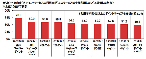 各ポイントサービスの利用者が「このサービスは今後も利用したい」と評価した割合をみると、「楽天スーパーポイント」(73.3%)がトップ。次いで「JALマイレージバンク」(59.9%)、「dポイント」(58.8%)。「利用しているポイントサービスでは2位だった『楽天スーパーポイント』が、リピート意向度でトップとなった」(同)