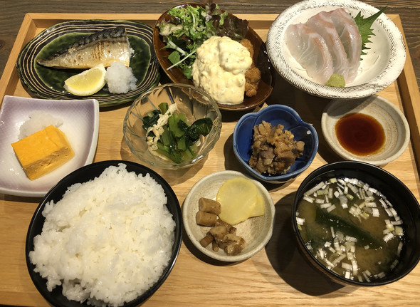 昼の部では、同社のエッセンスが詰まった「つかだ食堂の小鉢御膳」(税別1364円)が一番の売りだ。他に銀鮭レアカツや鉄板ホルモン焼きなどの定食がある。ごはん大盛無料で、800円の日替わり定食も用意した。