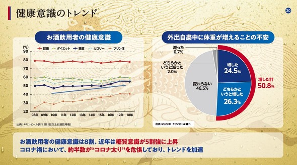 コロナ禍の外出自粛により、コロナ太りを気にする人が増えるなど、健康意識が高まっている。同社が扱う糖質オフやゼロといった発泡酒や第3のビールの販売数量は、1〜7月で前年比5%増加しているという。