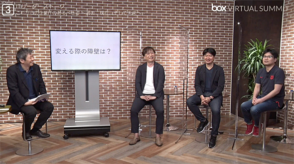 ゲストスピーカーは、荏原製作所 執行役 情報通信統括部長の小和瀬浩之氏と、前職はヤンマーの取締役CIO(最高情報責任者)を務め、現在は特定非営利活動法人CIO Lounge理事長の矢島孝應氏。モデレーターはBox Japan代表取締役社長の古市克典氏が務めた。