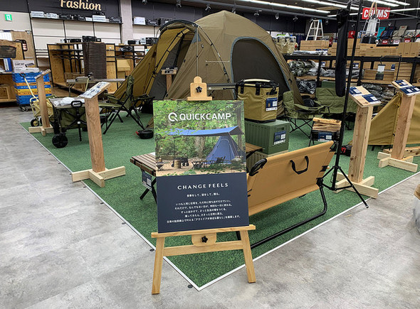 注目すべきは、eSPORTS(岐阜市)が展開するアウトドア通販サイト「eSPORTS」のプライベートブランド「クイックキャンプ」の商品を幅広く扱っていることだ。ワンタッチテント、アウトドアワゴン、車中泊マット、焚火陣幕など、ほぼ通販でしか買えなかったコストパフォーマンスに優れた「クイックキャンプ」の商品群が、実店舗で50種類以上も販売されるのは初めて。同ブランドの多くのファンが足を運んでいる。