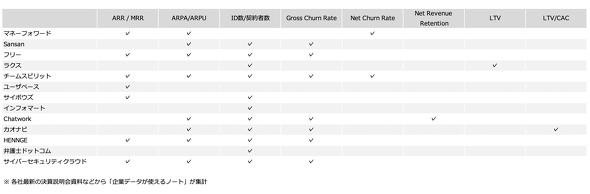 A SaaSビジネスを捉える上で、ARRの分解要素をはじめとした多くのKPIがあります。上場SaaS企業のKPI公表状況は以下の表組の通りです。
