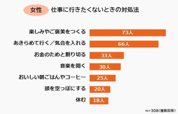 女性に「仕事に行きたくないときの対処法(複数回答可)」を聞くと、「楽しみやご褒美をつくる」(73人)が最も多く、「あきらめていく/気合を入れる」(66人)、「お金のためと割り切る」(33人)と続いた。