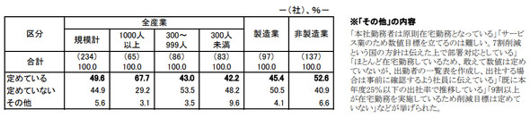 出勤者数の削減目標については、「定めている」が49.6%と半数だった。企業規模別にみると、1000人以上が67.7%、300人〜999人が43.0%、300人未満が42.2%と、大企業で目標を定めている割合が多かった。ただ、「すでにほとんどの社員が在宅勤務を実施しているため、あえて目標は定めていない」という企業もあった。