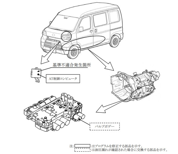 対象車では、AT制御コンピュータに不具合があった。まず、動力伝達装置において、バルブボデーが異常摩耗し、油圧漏れが発生するものがある。油圧漏れが発生した際、AT制御コンピュータのプログラムが不適切なため、故障検知を正しく行わないことがあり、油圧漏れを正しく検出できない。そのままの状態で使用を続けると、油圧漏れが大きくなり、最悪の場合、意図せずクラッチが係合し、一時的に急減速する恐れがある。