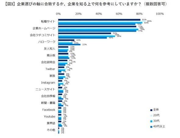 「企業選びの軸に合致するか、企業を知る上で何を参考にしていますか?(複数回答可)」と尋ねると、「転職サイト」(81%)という回答が最も多く、「企業ホームページ」(77%)、「会社クチコミサイト」(52%)と続いた。
