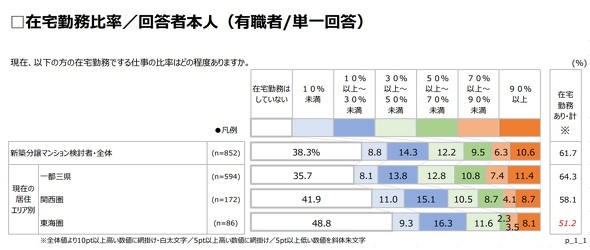 調査対象であるマンション購入検討者のうち、61.7%が実際に在宅勤務をしており、77.0%がこれからも在宅勤務が続くと予想している。在宅勤務時は「リビング」で仕事をしている人が61.2%と最も多く、次いで「寝室」「空いていた部屋」が共に20%台後半だった。