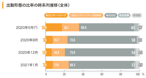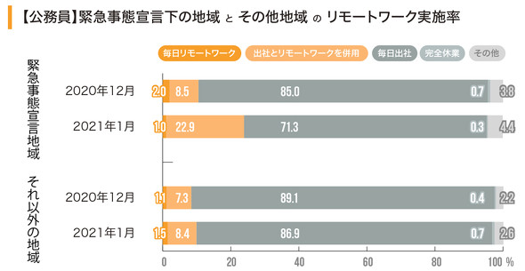 緊急事態宣言が出される前の20年12月の状況を尋ねると、「毎日リモートワーク」「出社とリモートワークを併用」を合わせた実施率は20.4%。1月に約4ポイント増加したことになる。