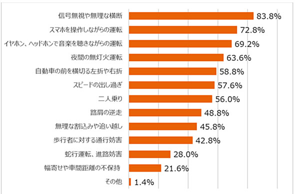 例えば、20年9月にセゾン自動車火災保険が、首都圏在住の40〜50代の自動車ドライバー500人を対象に調査をしたところ、「信号無視や無理な横断」(83.8%)、「スマートフォンを操作しながらの運転」(72.8%)、「イヤホンなどを用いて音楽などを聴いている」(69.2%)などマナーの悪い自転車を数多く目撃しており、約3割が「自転車と事故になったことがある」と答え、約6割が「事故になりそうになったことがある」と回答した。