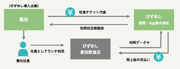 このサービスを利用できる飲食店は全国1万4000店。従業員が食事をすると、Gigiが提携する飲食店に代金を支払う。Gigiは社員の利用状況を企業に連絡し、企業は代金をGigiに支払うという仕組みだ。