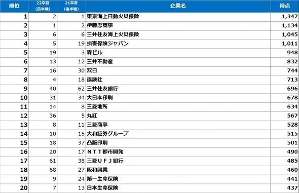 文系女子ランキングでは、「東京海上日動火災保険」(1347ポイント)が1位となった。次いで「伊藤忠商事」(1134ポイント)、「三井住友海上火災保険」(1045ポイント)、「損害保険ジャパン」(1011ポイント)と続いた。文系男子同様メガ損保が上位となり、9位の「三井住友銀行」(696ポイント)を含めトップ10に大手金融機関が4社ランクインした。また、巣ごもり需要で電子書籍を中心に業績が好調な「講談社」が713ポイントで8位となった。