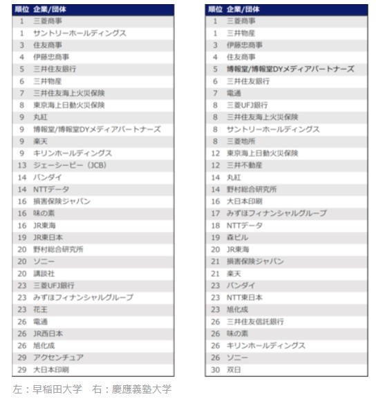 早稲田大学と慶應義塾大学のランキングでも総合商社は上位にランクインしている。一方、博報堂/博報堂DYメディアパートナーズや電通が上位に入っているのが特徴的だった。