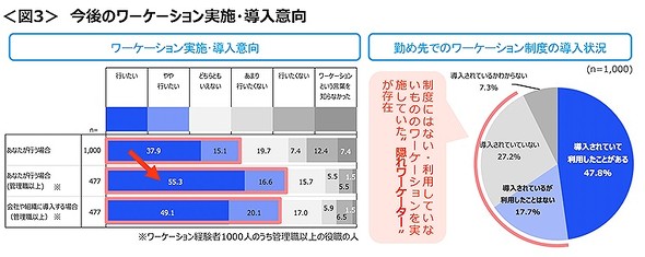 山梨大学の田中敦教授は「フレックス・プレイス制度の導入など働く場所の自由度を高め、社員が安心してワーケーションを行うことができる仕組みを検討する必要がある」とコメントした。