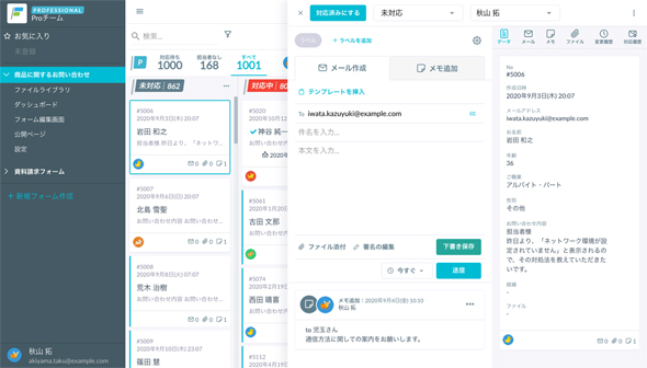 質問は幅広い内容で日々大量に届くため、同社では効率的に回答できるよう、formrunのメールテンプレート機能を使って約80ものテンプレートを活用している。また、formrunは検索機能を搭載しており、名前やメールアドレスで検索すれば過去の問い合わせ内容をすぐに参照できる。「以前にいただいた質問を踏まえて回答できるので便利です」と玉井氏は話す。