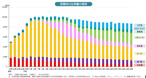 経営の考え方としては間違ってないと思います。ただ、当時既に、日本酒業界全体として長期低迷の時代に突入していました。日本酒業界の問題で言いますと、国内では1972年にピークを迎え、その後48年間かけてずっと右肩下がりなんです。出荷量に関しては最盛期の4分の1、つまり25%にまで落ちています。