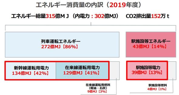 鉄道事業で消費するエネルギーのほとんどは電力だ。JR西日本では列車運行エネルギーの約97%が電車で、残り3%がディーゼルカーまたは蒸気機関車だ。駅施設など列車運行以外のエネルギーも90%が電力で、暖房や給湯ボイラーなど10%が燃料となっている。これらを総じて、JR西日本の鉄道事業全体の化石燃料使用率は4%である。つまりエネルギーの消費者として、ほとんどCO2を排出していない。