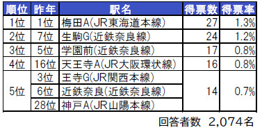 「住みたい街(駅)ランキング」の1位は、2年連続でJR東海道本線「梅田A駅」、2位は昨年7位の近鉄奈良線「生駒G駅」、3位は昨年5位の近鉄奈良線「学園前駅」だった。(2つの近接駅を統合した場合は駅名の後にGを、3つ以上の近接駅を統合した場合はAを付記)