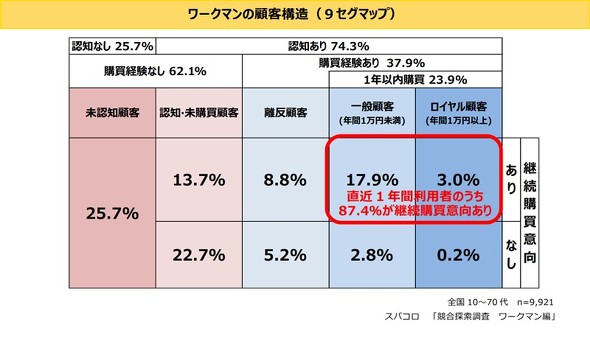 ワークマンの顧客構造を分析すると、直近1年間で1万円以上購入している「ロイヤル顧客」の割合は3.2%、1年間で1万円未満を購入する「一般顧客」は20.7%だった。年間で5人に1人以上がワークマンでの買い物を経験していることが分かった。また、直近1年間の購買者における継続購入意向者の割合は87.4%と、9割近くに上った。