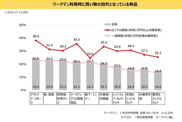 ワークマン利用時に買い物目的になっている商品を調べると、「アウトドア/スポーツ」(24.6%)が最も多く、「靴/長靴」(23.8%)、「防寒着/防寒グッズ」(23.3%)、「ワークマンプラス関連商品」(22.1%)と続いた。