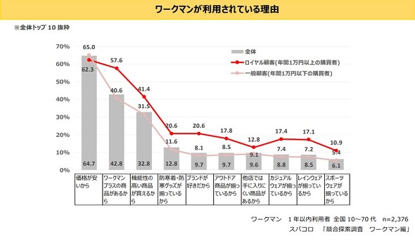ワークマンを利用している理由の1位は「価格が安いから」(64.7%)で、「ワークマンプラスの商品があるから」(42.8%)、「機能性の高い商品が買えるから」(32.8%)と続いた。