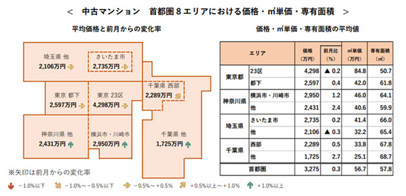 不動産情報サービスを運営するアットホームは、首都圏における中古マンションの価格動向を発表した。その結果、首都圏の中古マンション1戸当たりの平均価格は前月比0.3%増の3275万円だった。首都圏の1戸当たりの平均価格は東京都下、横浜市、川崎市が前年同月と比較して下落した一方、それ以外のエリアは上昇した。