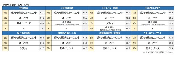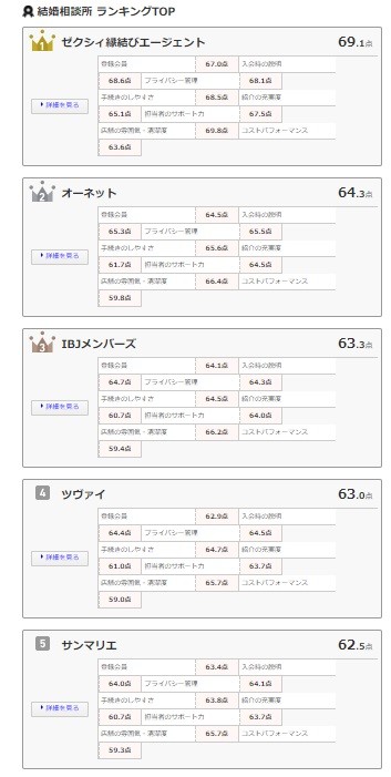 結婚相談所の調査では「ゼクシィ縁結びエージェント」が4年連続で総合1位にランクイン。評価項目別の「登録会員」「プライバシー管理」「手続きのしやすさ」「店舗の雰囲気・清潔度」など全8項目だけでなく、部門別の「男性」「女性」や、年代別「20代」「30代」「40代以上」と全ての項目で3年連続1位を獲得した。oricon MEは「幅広い世代から支持を得た」としている。
