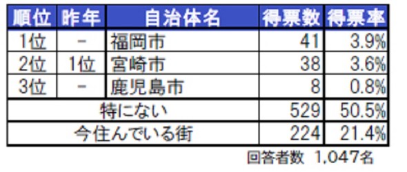 集計対象を九州・沖縄に拡大した結果、21年の住みたい街ランキング1位は「福岡市」(20年圏外)となった。次いで「宮崎市」(20年1位)、「鹿児島市」(20年圏外)の順だった。「住みたい街がとくにない」(50.5%)、「今住んでいる街に住み続けたい」(21.4%)と回答者の71.9%が、今住んでいる街を評価していることが分かった。