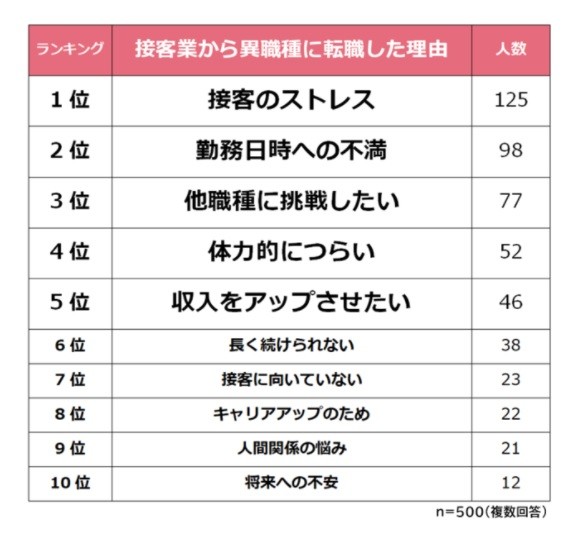 「接客のストレス」と回答した人からは「ずっと笑顔で接客することに疲れてしまった」(女性、23歳で転職)、「クレーマーや態度の悪い人への接客に疲弊した」(男性、30歳で転職)、「接客業は気を使って神経がすり減ると感じたから」(女性、39歳で転職)といった声が寄せられた。