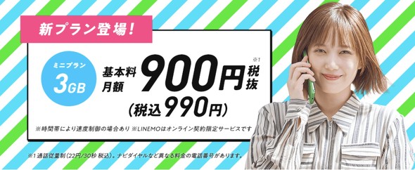 ソフトバンクはスマホ低価格料金プランLINEMOの新しい料金プランとして、7月15日からデータ通信利用の少ない人向けに「ミニプラン」を提供する。毎月3Gバイトのデータ容量と、データ容量を消費せずに「LINE」が使い放題となる「LINEギガフリー」が付き、基本料金は月額990円で提供する。